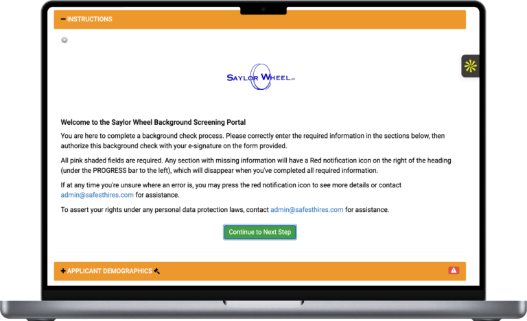 Quick invite widget lets users send an email or email + text invite to the applicant. They read some instructions, click a link to our protal and enter the info to run the background check. They read all legally required forms and e-sign the consent form. Mobile optimized for ease on smartphones.